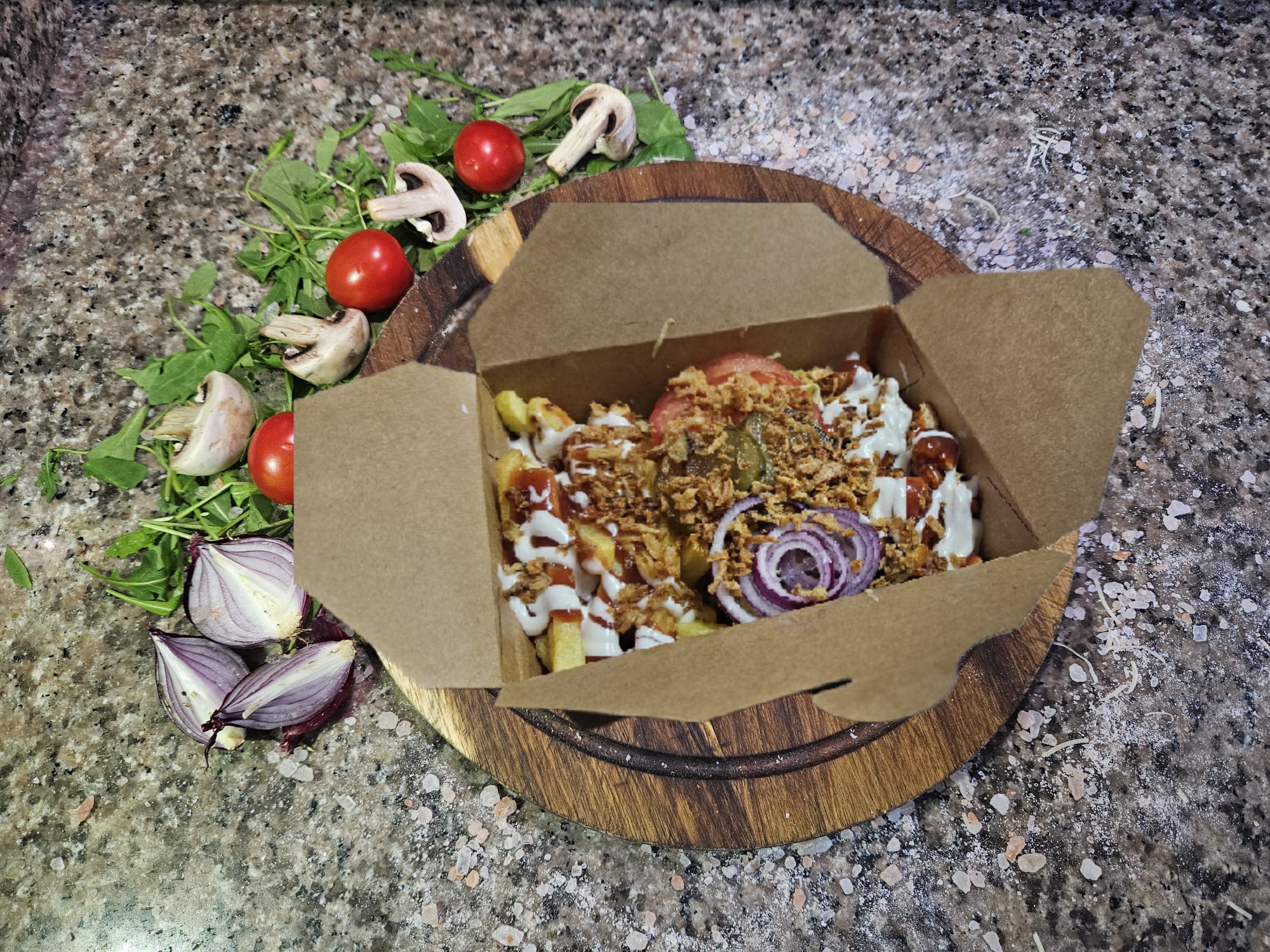 piept pui, condimente kebab, cartofi pai, varza, rosii, castraveti murati, ceapa rosie, fulgi ceapa crispy, ketchup, maioneza cu usturoi, lipie