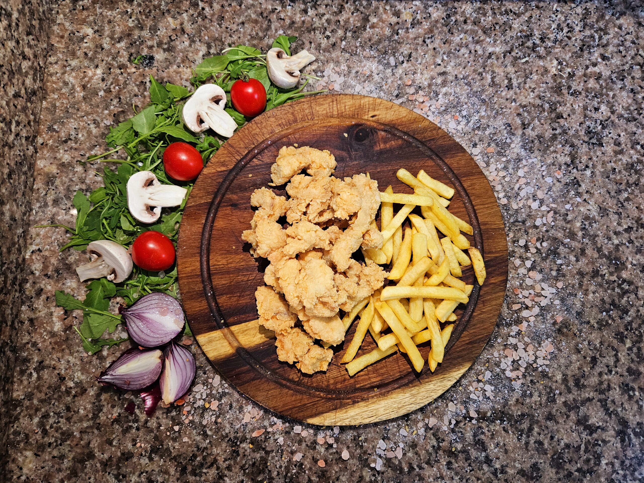 mini stripsuri pui, cartofi prăjiți, 1 sos ketchup dulce